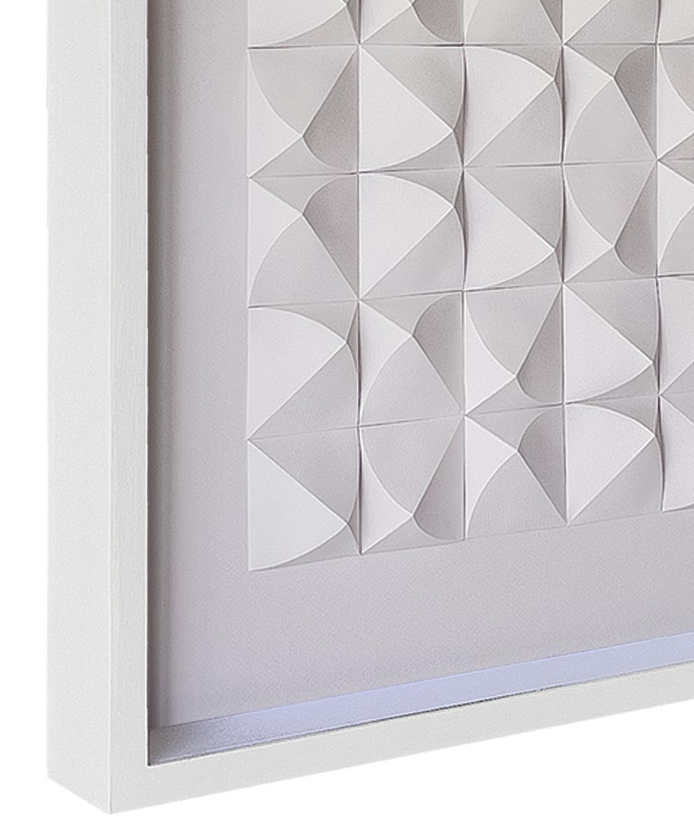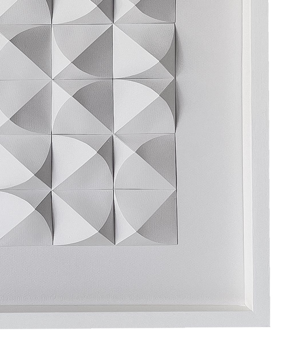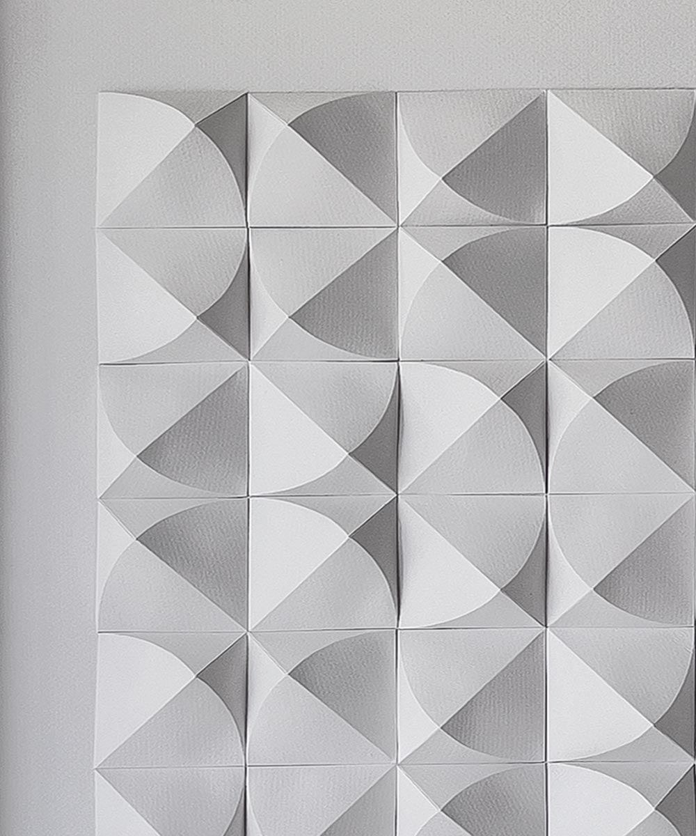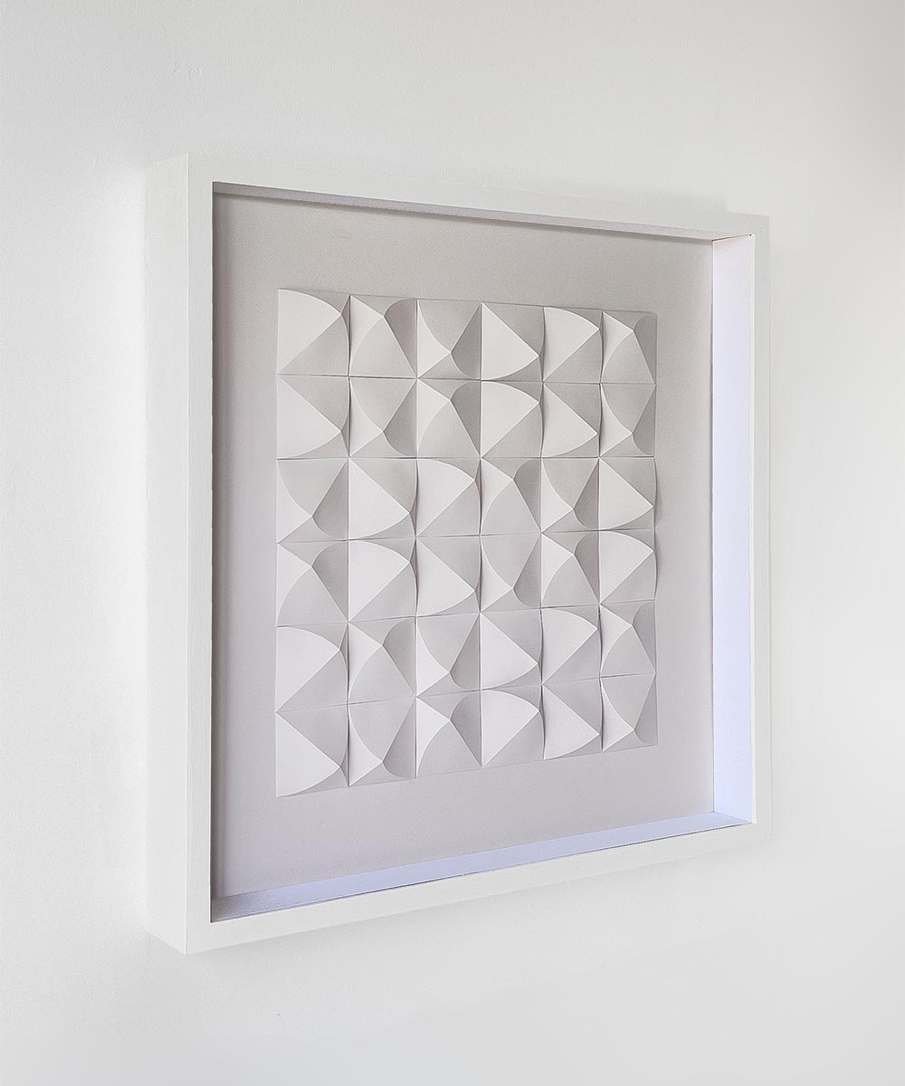 These hand-folded paper sculptures invite viewers to explore how light transforms each surface, casting soft, shifting shadows that bring the forms to life and highlight the delicate balance of depth and structure. Each piece is meticulously arranged within a precise grid.