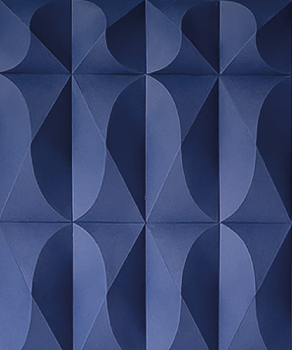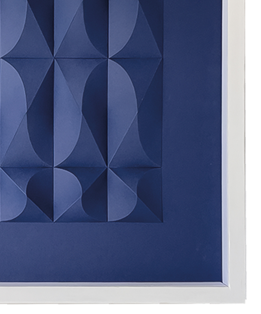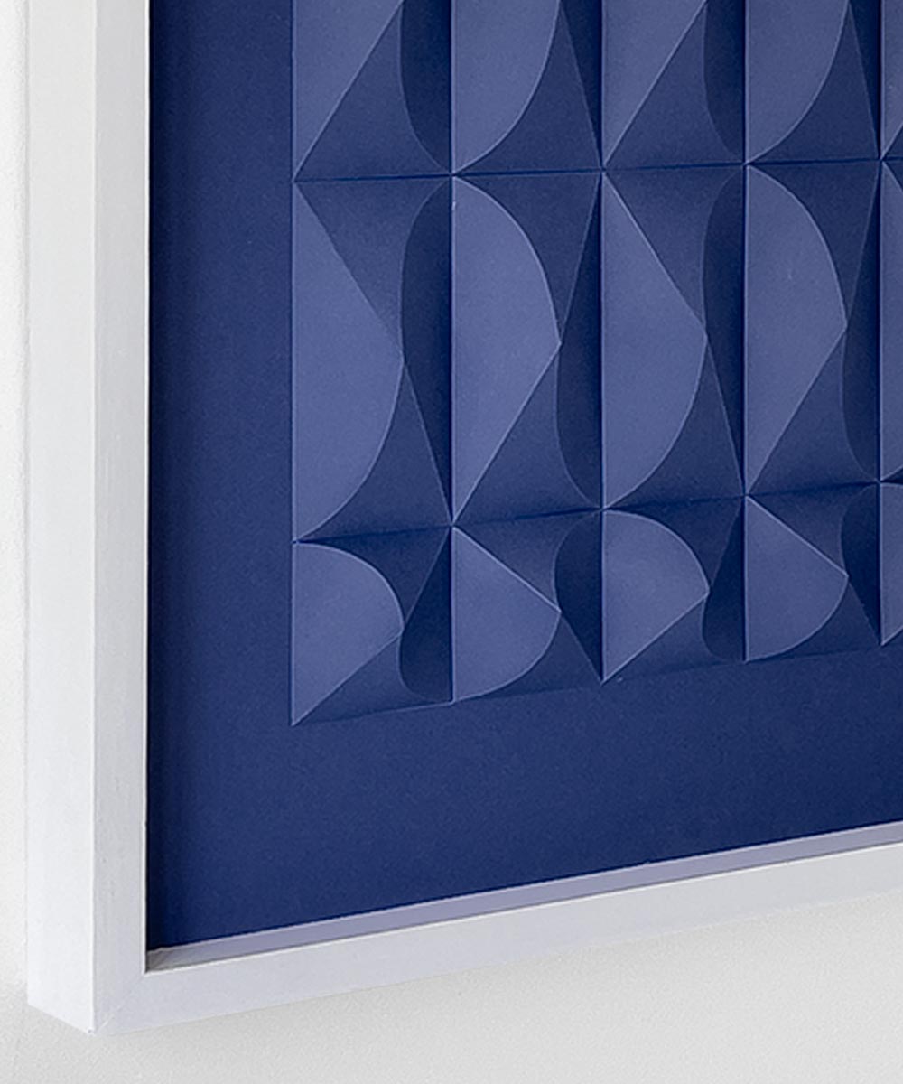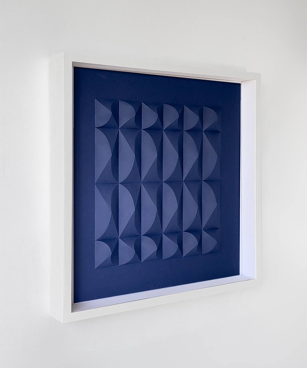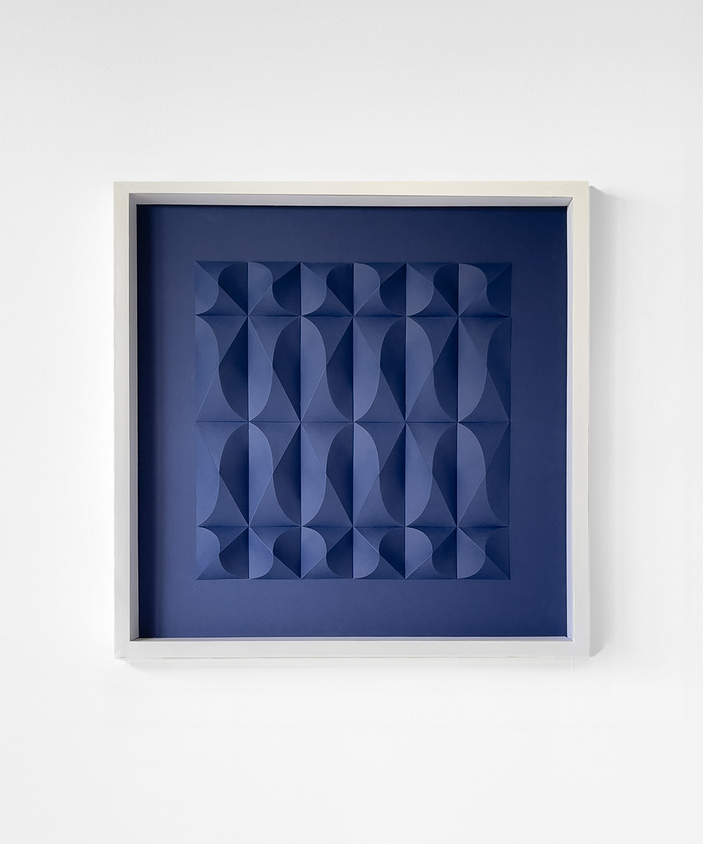These hand-folded paper sculptures invite viewers to explore how light transforms each surface, casting soft, shifting shadows that bring the forms to life and highlight the delicate balance of depth and structure. Each piece is meticulously arranged within a precise grid.