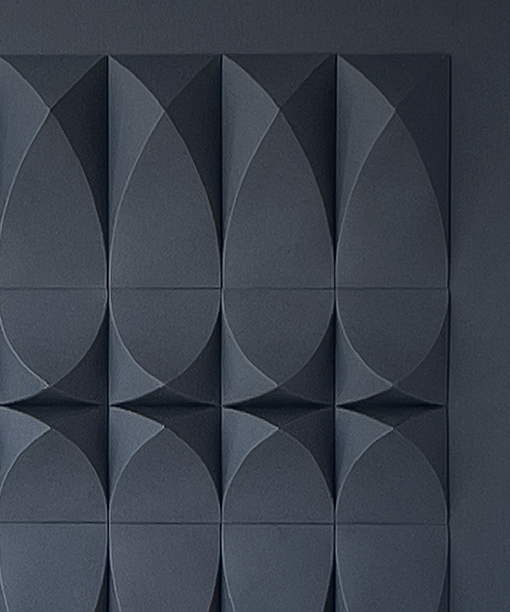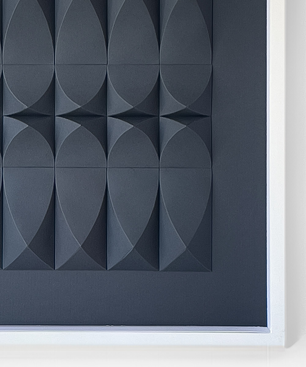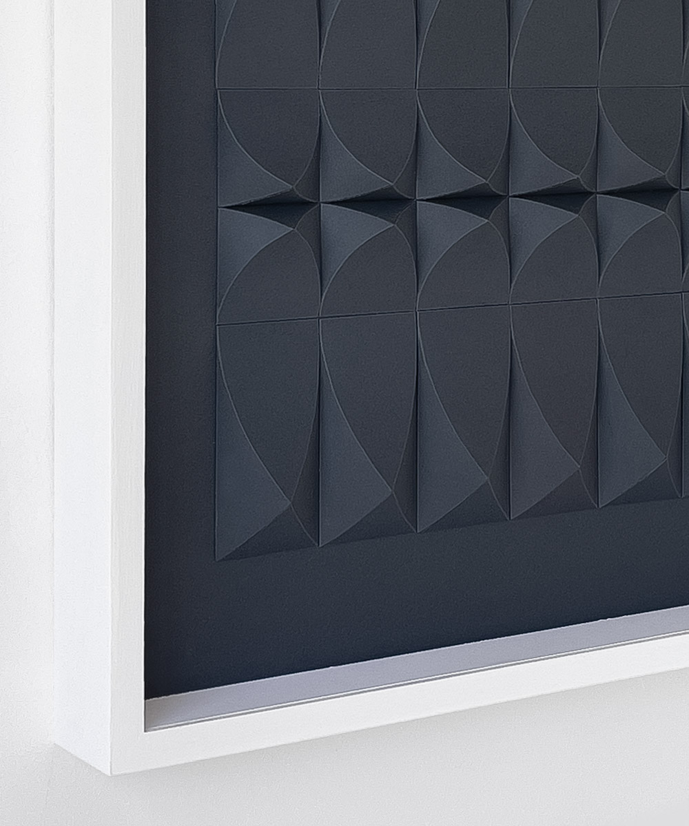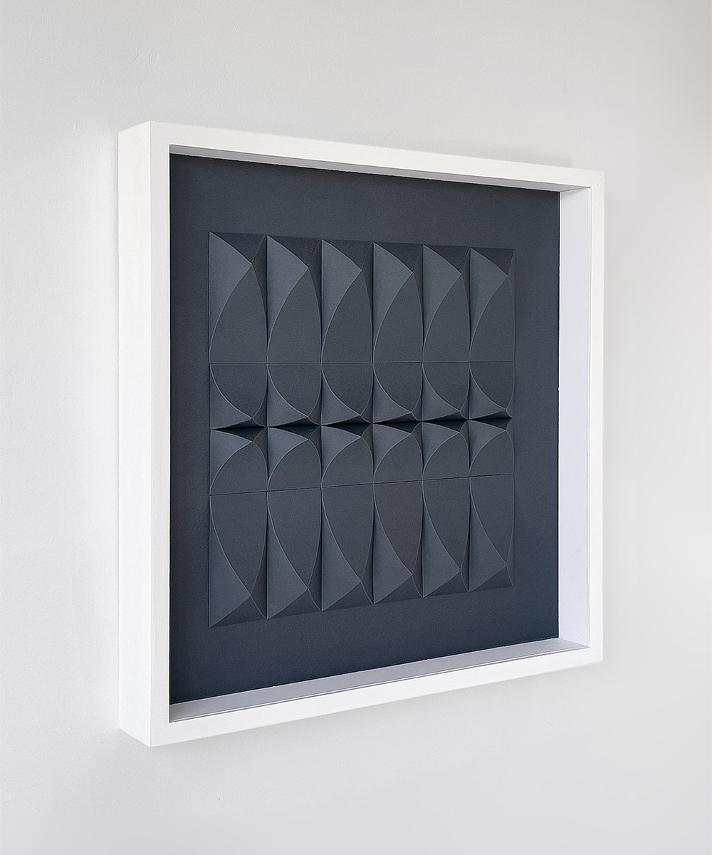 These hand-folded paper sculptures invite viewers to explore how light transforms each surface, casting soft, shifting shadows that bring the forms to life and highlight the delicate balance of depth and structure. Each piece is meticulously arranged within a precise grid.