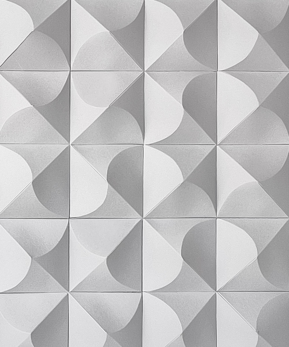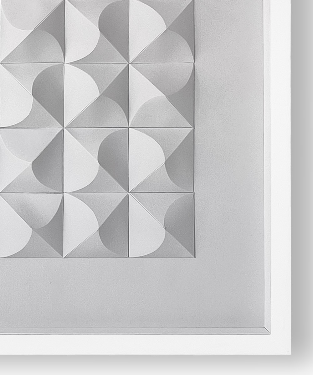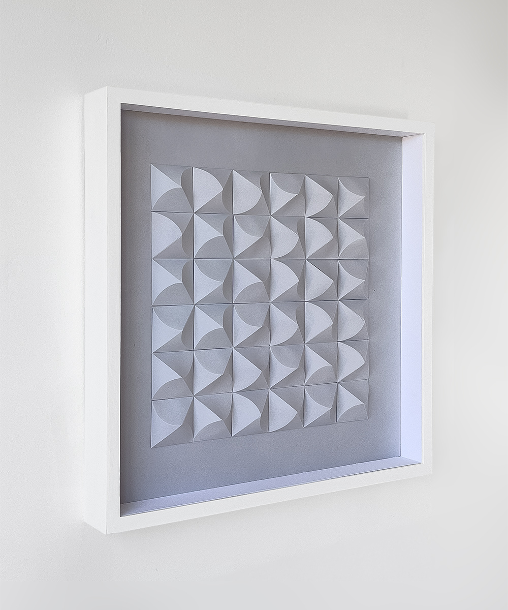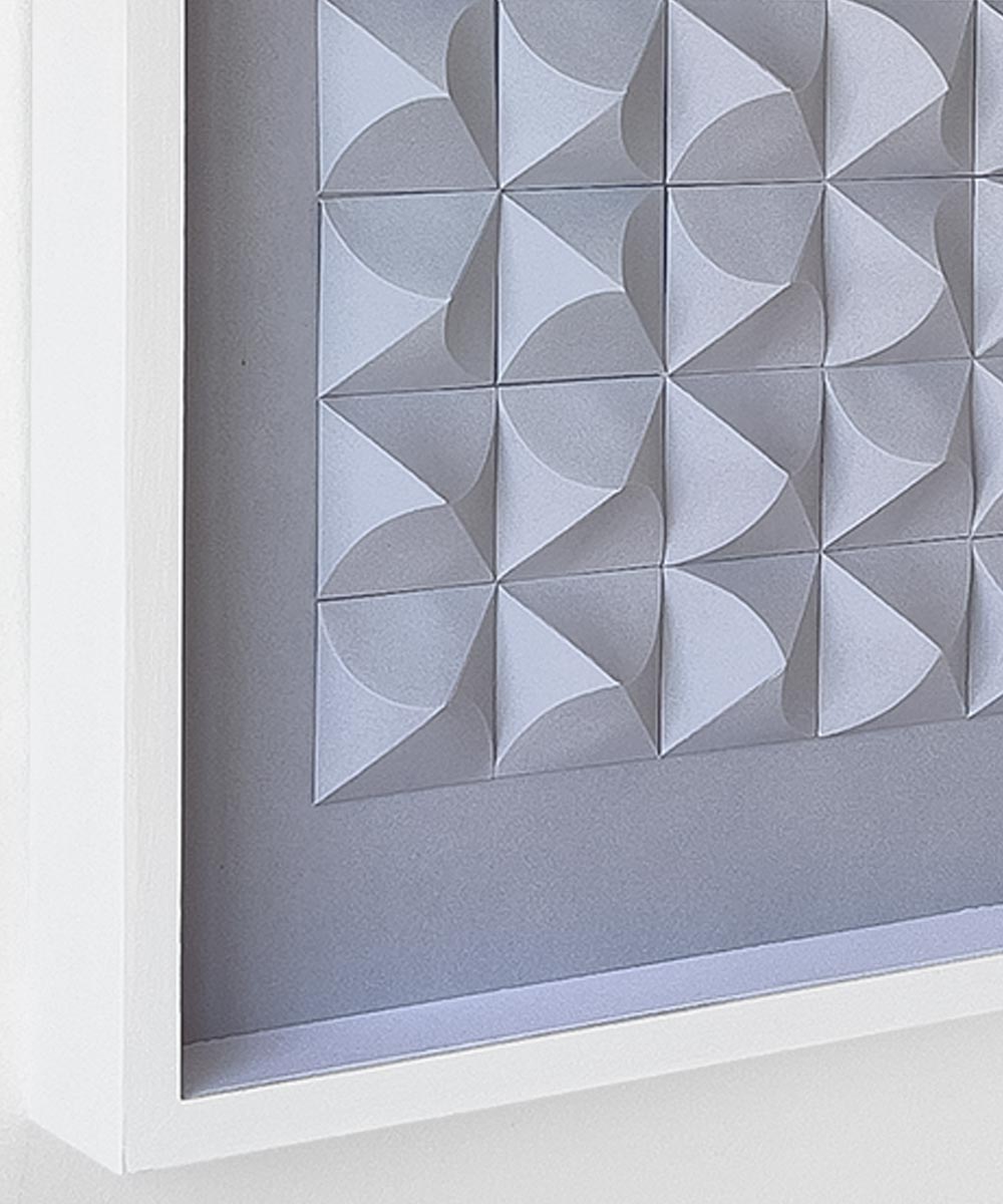 These hand-folded paper sculptures invite viewers to explore how light transforms each surface, casting soft, shifting shadows that bring the forms to life and highlight the delicate balance of depth and structure. Each piece is meticulously arranged within a precise grid.